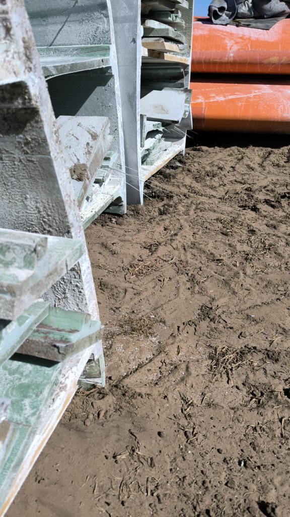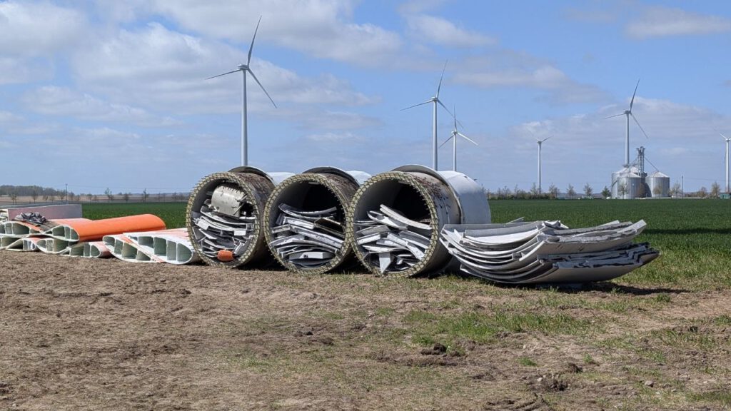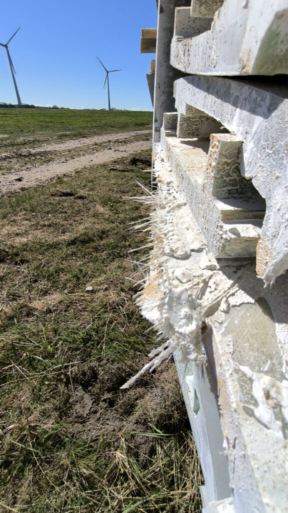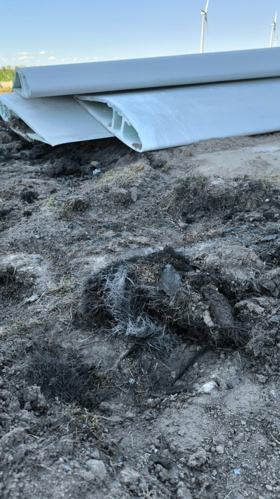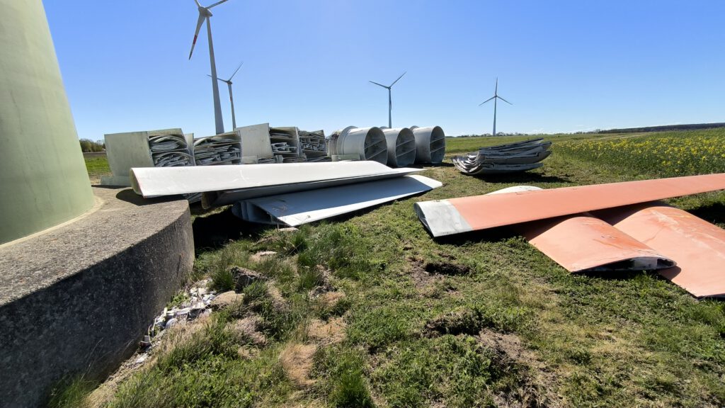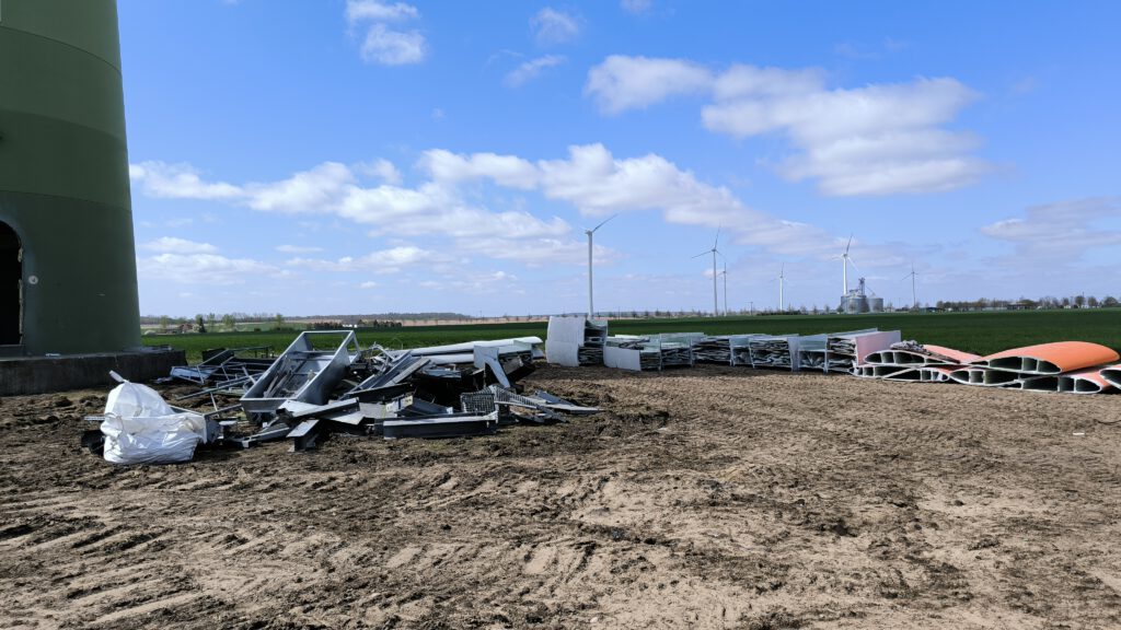 Bei vier Anlagen wurden die Rotorblätter und Gondeln bereits demontiert und direkt vor Ort am Boden zerlegt. Dabei werden die Eingriffe in die Umgebung sichtbar – sowohl hinsichtlich der Flächennutzung als auch im Umgang mit den Materialien.