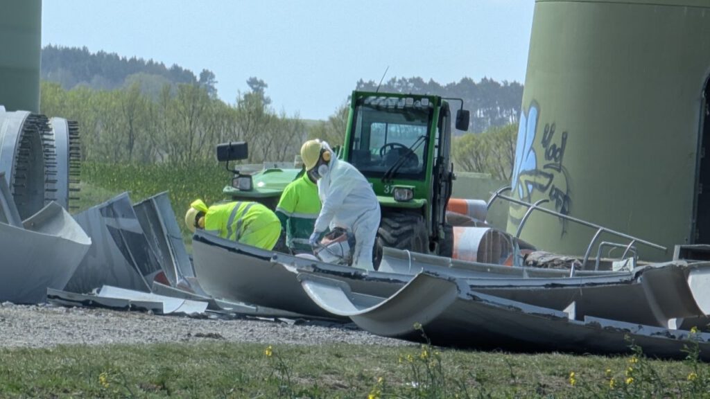 Arbeiter in Schutzanzügen zersägen die Rotorblätter direkt vor Ort, der Wind verteilt den entstehenden Staub (trotz Nassschnitt) auf den umliegenden Ackerböden.